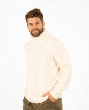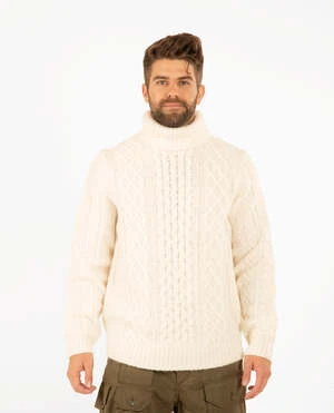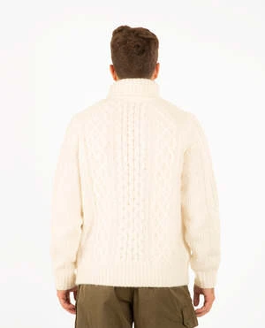 Fisherman Cable Turtleneck in ivory by Alex Mill. Featuring with a ribbed hem and sleeves, classic cableknit pattern and thick roll collar, it’s the ultimate cold weather classic.
