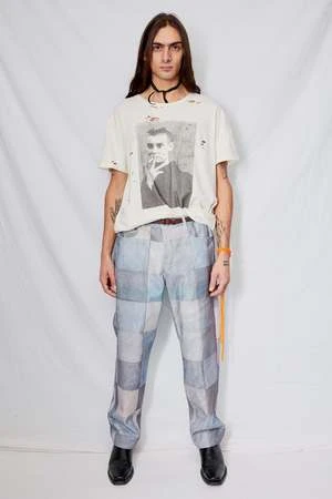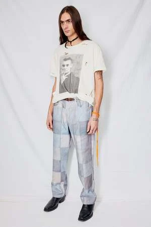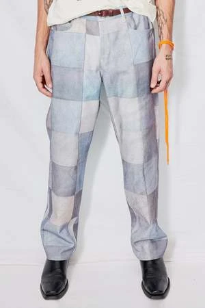 Patchwork Print Denim Five Pocket Jean from Assembly New York. Relaxed fit high-waisted five pocket jeans.