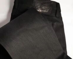 Brown denim with a rope-dyed brown warp and an undyed, unbleached, raw-edged weft.
