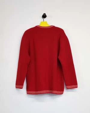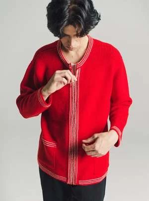 This cardigan is inspired by a sweater from the 1970s owned by Emily’s mother. We reproduced the original piece, with its zip front and white striping details around the placket and pockets.