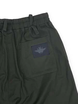 Baggy fit pants made from crisp, 98% organic cotton 2% EA fabric with a logo on the back. The piece is finished with hooks that can be used to add attachments.